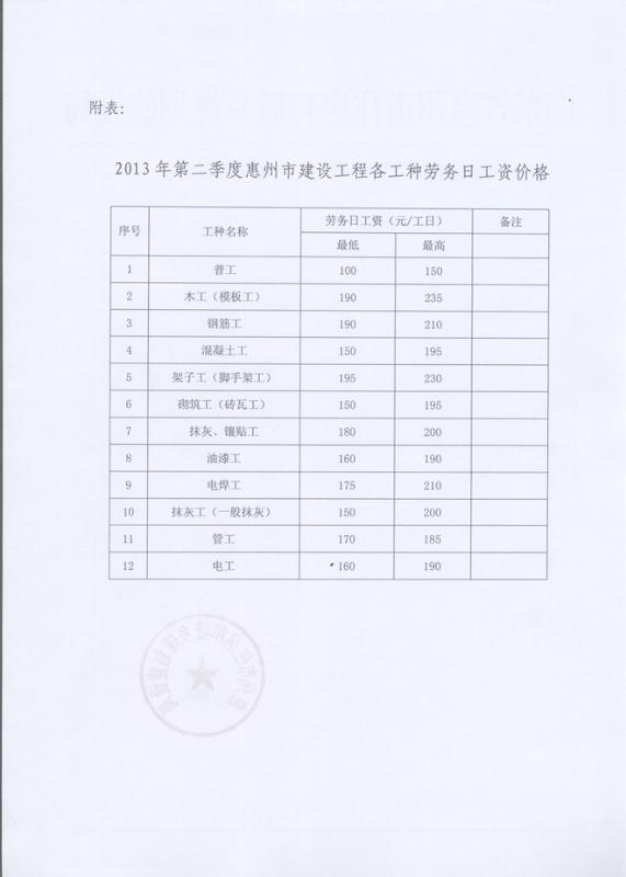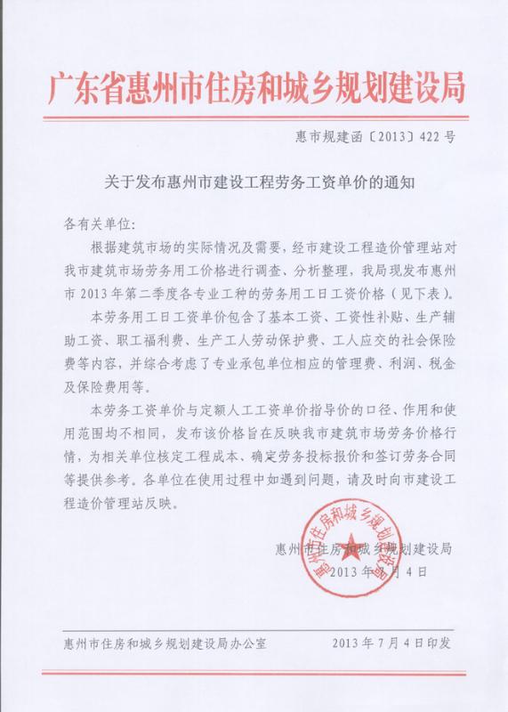 關(guān)于發(fā)布惠州市建設(shè)工程勞務(wù)工資單價的通知(惠市規(guī)建函〔2013〕422號)