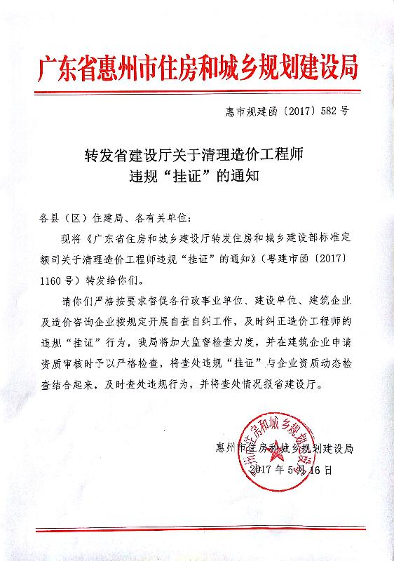 附件:廣東省住房和城鄉(xiāng)建設(shè)廳轉(zhuǎn)發(fā)住房城鄉(xiāng)建設(shè)部標(biāo)準(zhǔn)定額司關(guān)于清理造價(jià)工程師違規(guī) “掛證”的通知