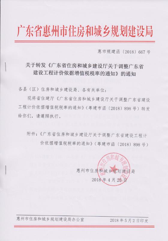 附件:《廣東省住房和城鄉(xiāng)建設廳關于調(diào)整廣東省建設工程計價依據(jù)增值稅稅率的通知》(粵建市函〔2018〕898號)